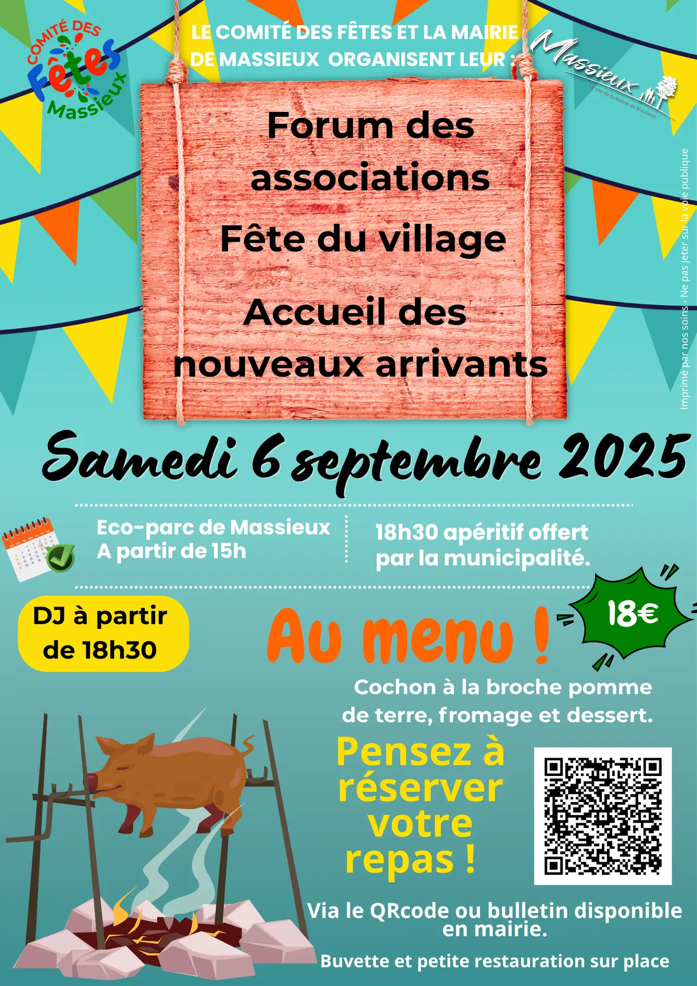 Un apéritif sera offert par la mairie à tous les participants. Prolongez la soirée en famille ou entre amis avec la Fête du village ! Un repas convivial composé de cochon à la broche, pommes de terre grenailles, fromage et dessert sera proposé sur place, suivi d’une soirée musicale pour danser et profiter ensemble d’un moment chaleureux. Pensez à réserver votre repas dès maintenant en ligne via ce lien : https://www.helloasso.com/associations/comite-des-fetes-de-massieux/evenements/repas-fete-du-village-6-septembre-2025 Nous vous attendons nombreux pour partager cette belle journée !